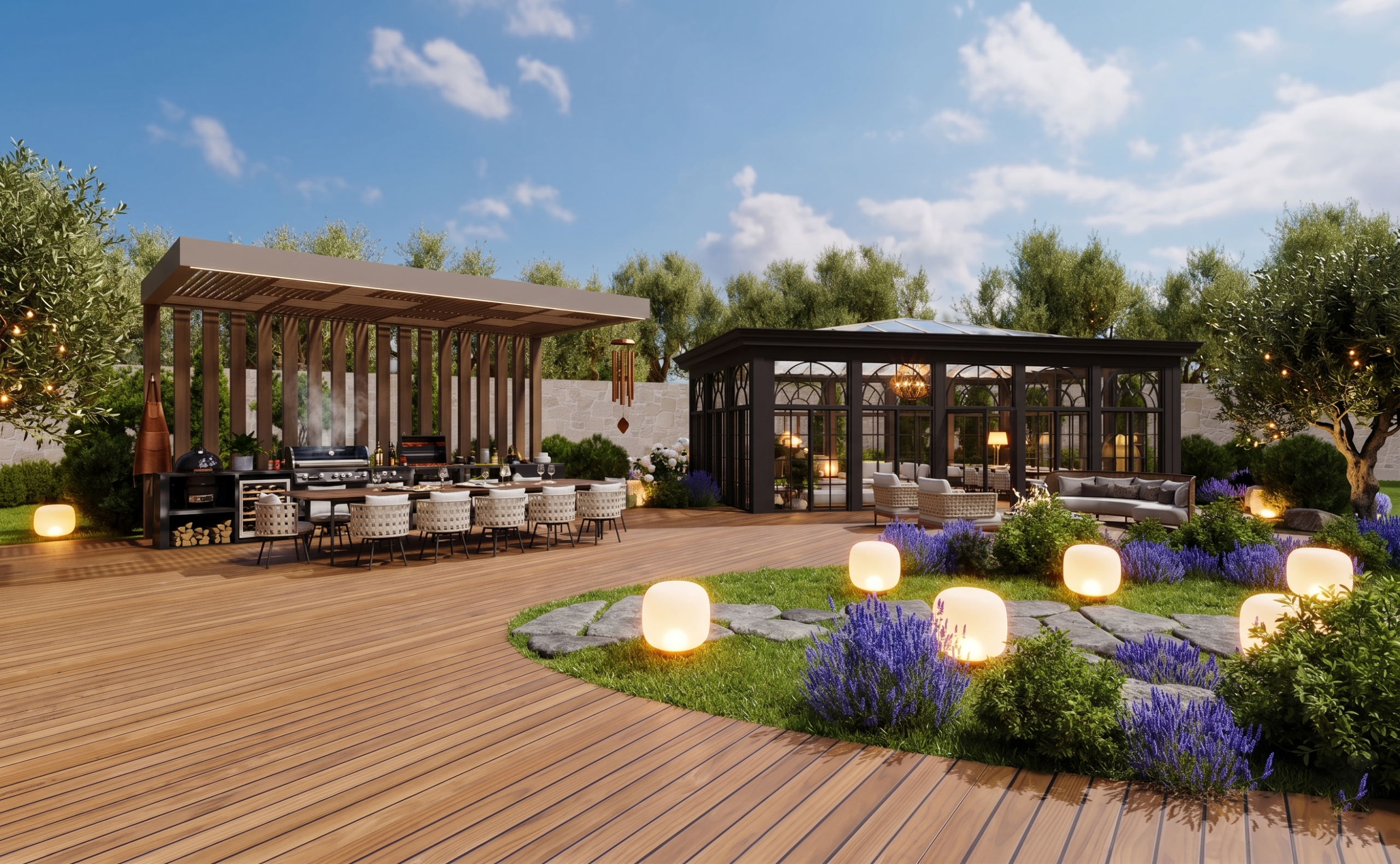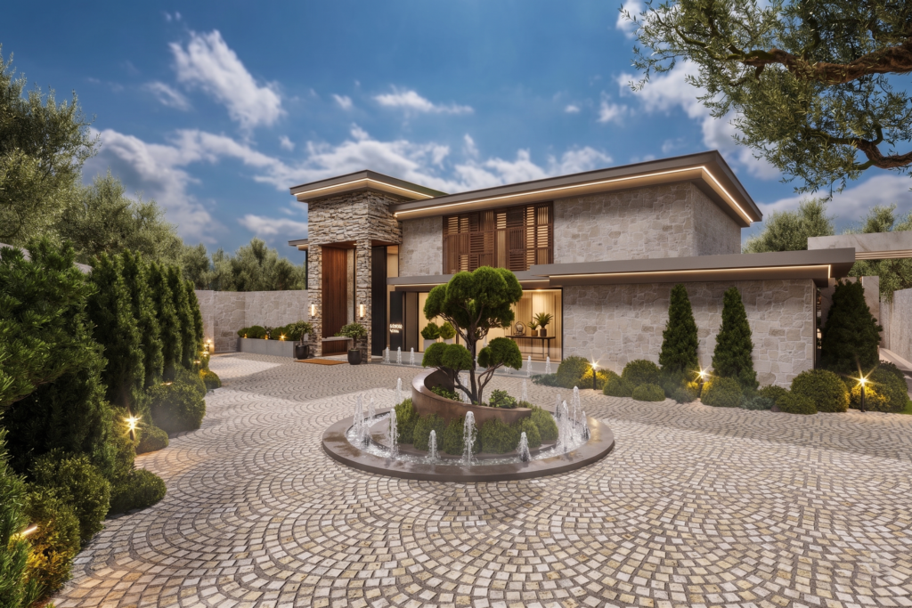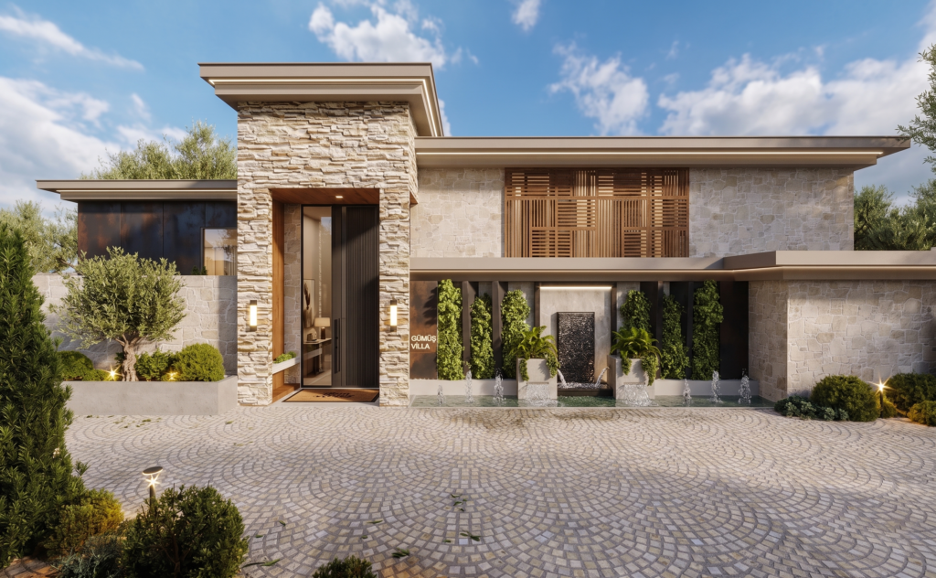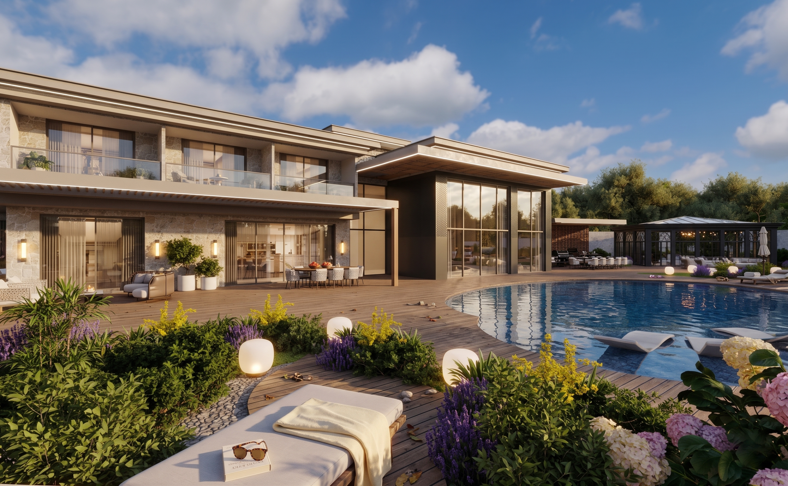 Urla Villa is a modern luxury residence that blends contemporary architecture with natural serenity through open, light-filled spaces and expansive glass façades. Double-height windows, balanced volumes, and natural materials like stone and warm wood create a seamless connection between indoor and outdoor living. The organically shaped pool and surrounding terraces form the heart of the villa, offering a refined lifestyle retreat that reflects modern Mediterranean living in İzmir.